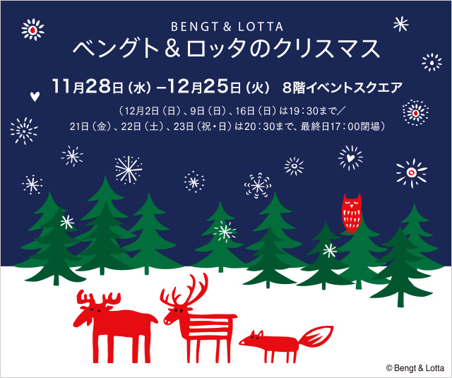 ロッタ・グラーヴェさんサイン会 8階イベントスクエア特設会場にて、クリスマスチャリティピンバッジをお買い上げのお客様に、オリジナルクリスマスカードをプレゼント。その場でロッタさんがクリスマスカードにメッセージとサインをいたします。 開催日時:12月1日(土) ①11:00-12:00 ②13:00-14:00 定員:各回30名様限り