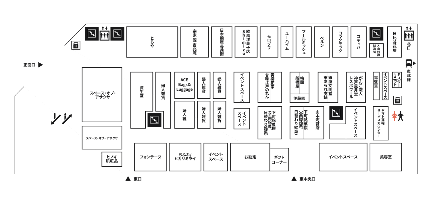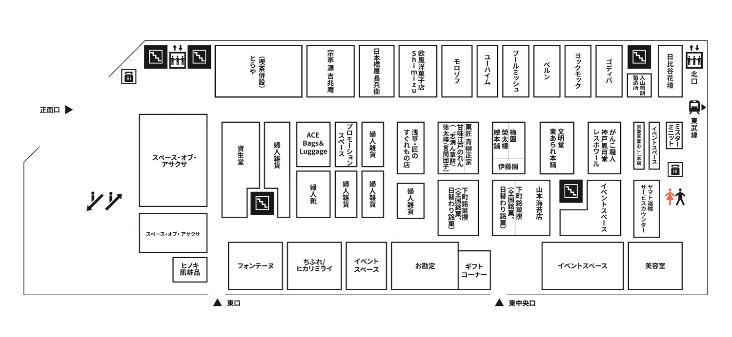 1F 和洋菓子「浅草すいーつ小町」|化粧品|婦人雑貨|ギフトコーナー|フラワーショップ|ヤマト運輸サービスカウンター|ミスターミニット