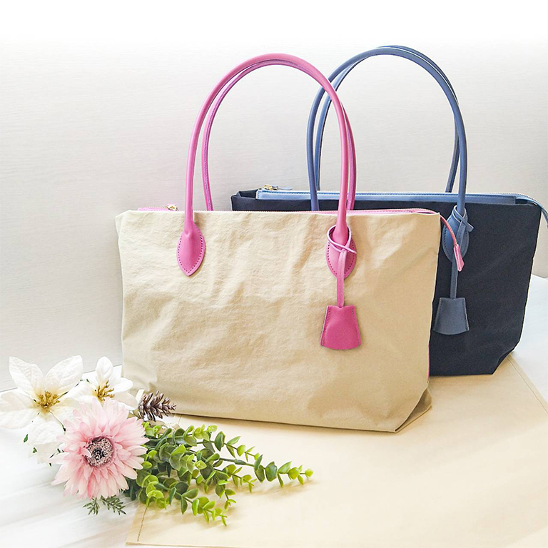 石川県にある化学素材メーカー、小松マテーレ株式会社が開発した“スタンディング・ファブリック”である「KONBU®」は、海産物の昆布のようなドライな質感を持つナイロン素材です。とても軽量で硬度も高く、毎日使うバッグにはまさに最適な素材となります。A4サイズを収納できて超軽量、しっかりとした革の持ち手は肩掛けもしやすい長さです。 2つの内ポケットに加えて、上部のファスナーを開かなくても出し入れできる便利なあおりポケット付き。 こちらは幅が16㎝程あり、ちょうどスマホを横向きにするっと入れられるくらいのサイズ感です。 深さは15㎝なので、奥まで潜り込んでしまうこともありません。 また、持ち手と同じ革で作られたキークロシェットは、実用性あり、可愛さもあり。ひとつあるといいですよね。 お仕事用にはもちろん、ちょっと遠出する時や、お荷物の多いお出かけの日にも。 使えるシーンの多い、なにかと助かるバッグです。
