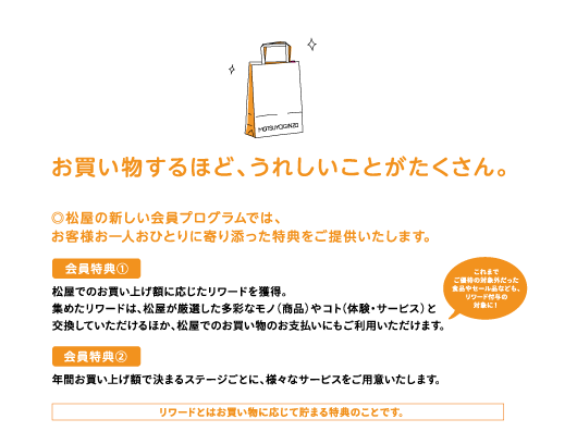 松屋クレジットカードをお持ちのお客様は、松屋の新しい会員プログラムへのご登録によって、新たなサービスをお楽しみいただけます。