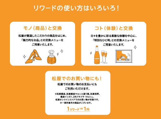 松屋銀座・松屋銀座マロニエ通り館・松屋浅草・銀座インズ内プチプチマルシェ・松屋オンラインストアでのお買い物が、ご優待および年間クレジットご利用額の対象となります。※商品券、一部食品ギフト券等ご購入にご利用いただけない商品がございます。