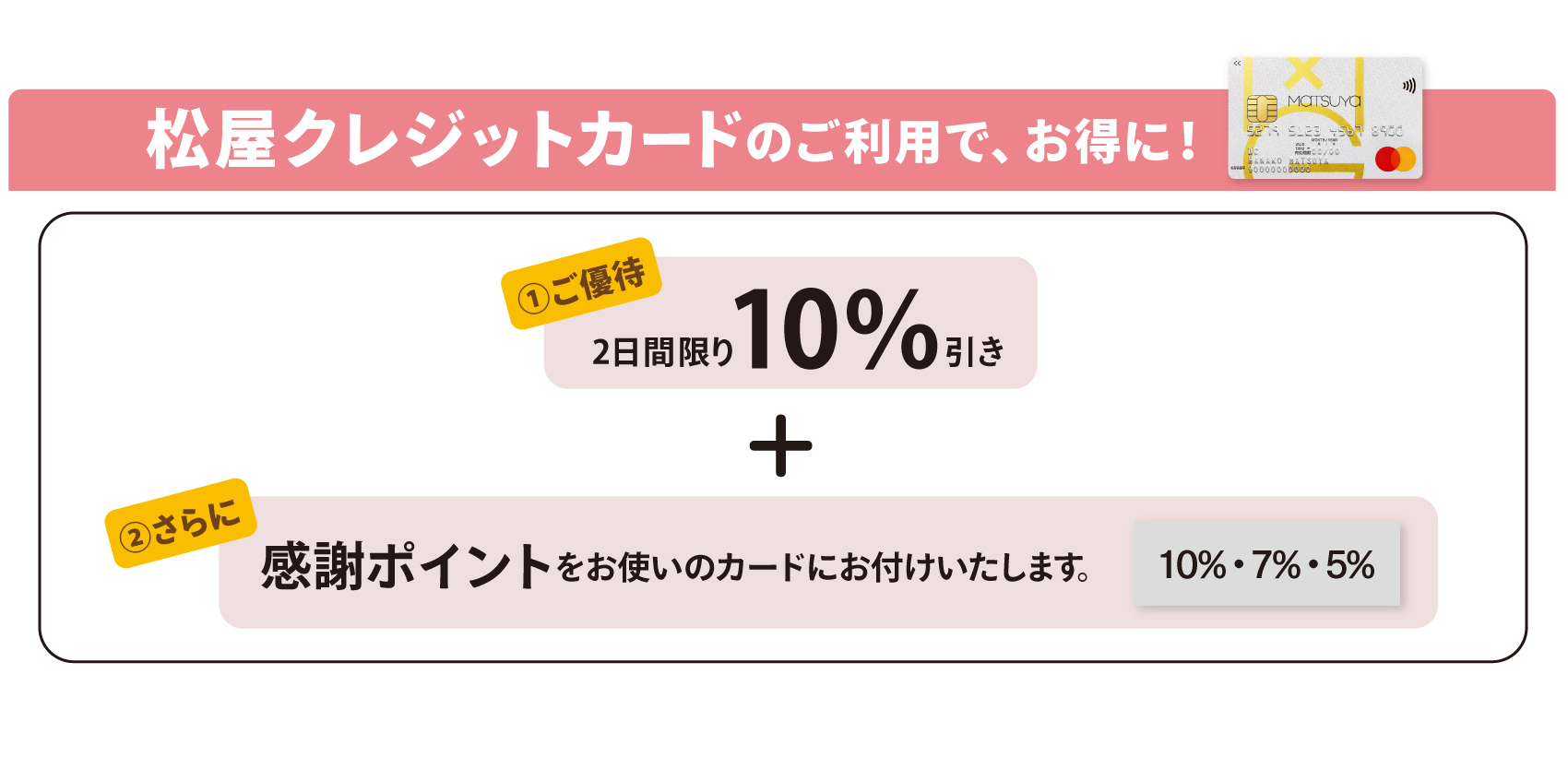松美会当日「松屋クレジットカード」のお買い物で対象商品が10%ご優待でお買い物いただけます。
