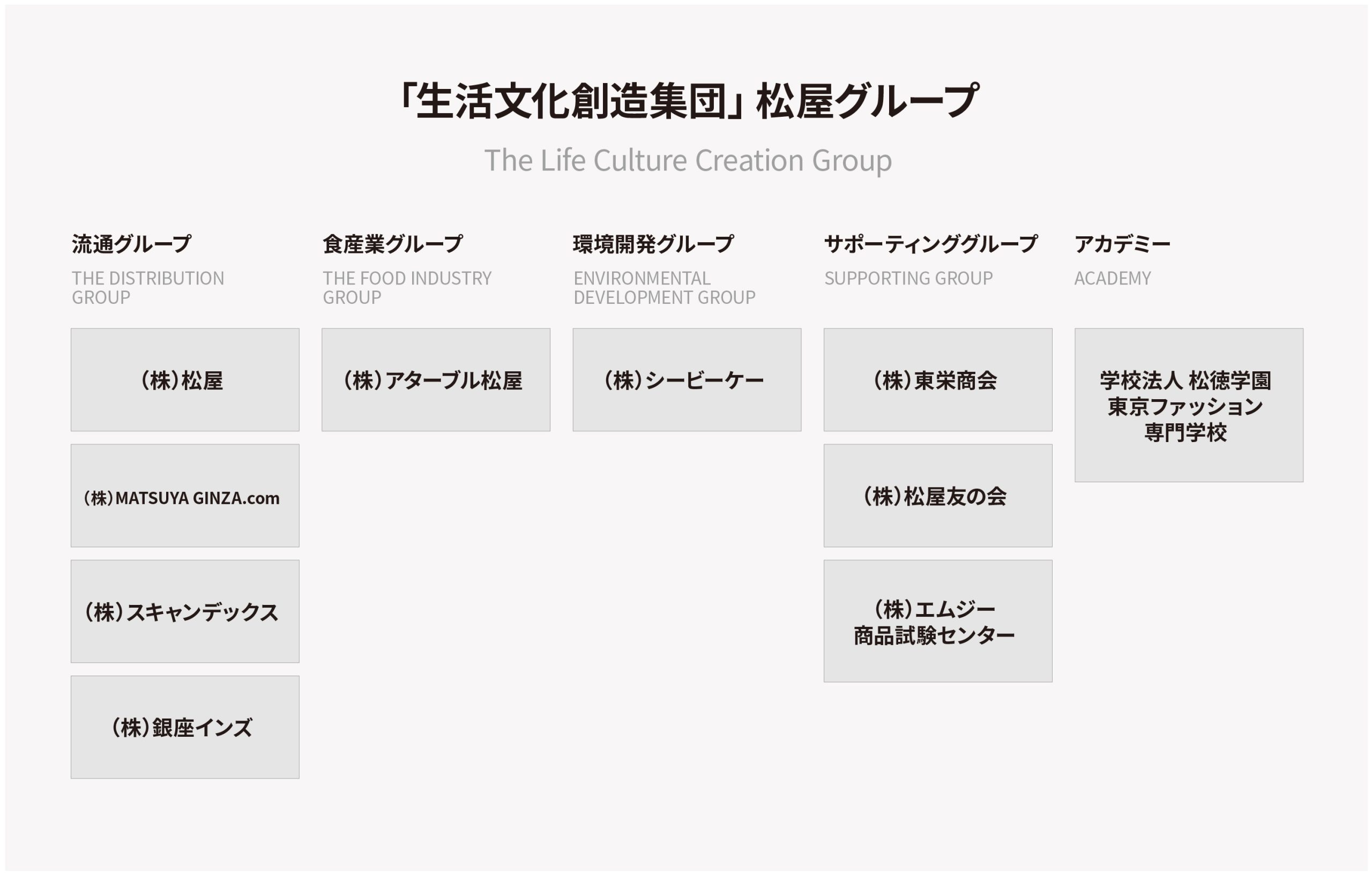 企業理念 生活文化創造集団 松屋は、創業からいつの時代においてもお客様と共にあり、お客様の生活の変遷に沿って革新を重ね、成長を遂げてまいりました。 現在、政治・経済から人々の価値観・気分まで、これまでの予測を超えて大きく転換し、時代の波はそのスピードとうねりを増しています。私たち松屋にも、今まで以上に時代を素早く捉え、変化に先んじて提案できる企業であることが求められています。 松屋グループは、百貨店を核に、常にお客様とともに「GINZA」を体現する企業グループとして歩んでまいります。