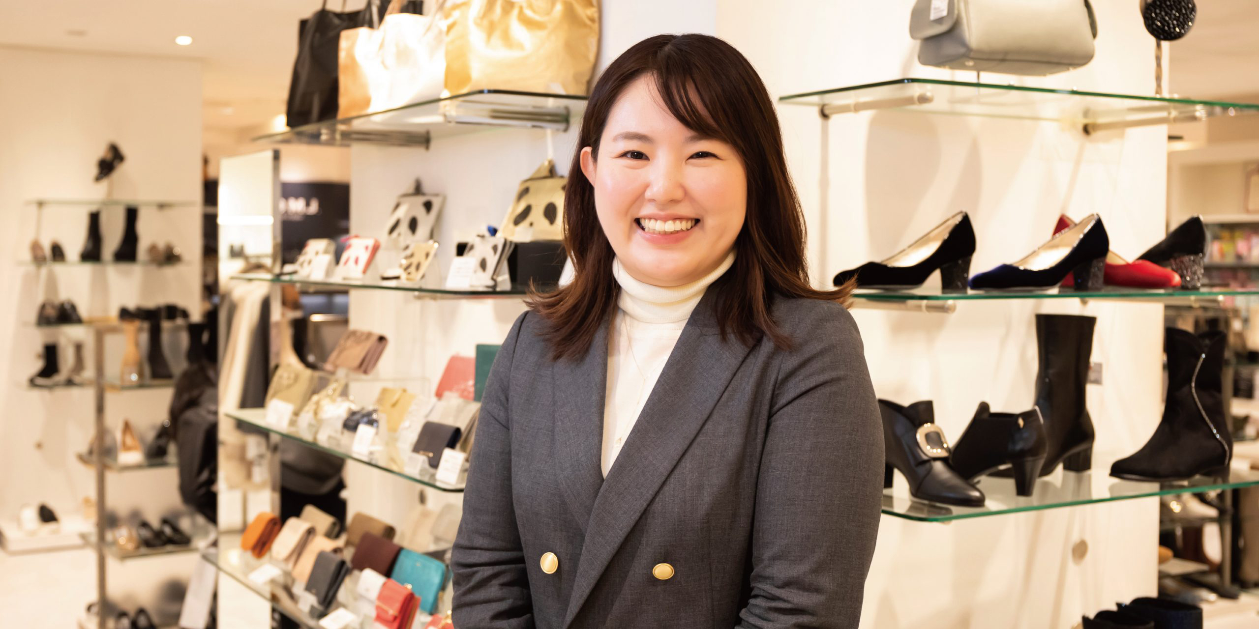 自主運営部は、自分たちで仕入れた商品を自分たちで販売するという、百貨店の原点ともいえる業務を担う部署です。私たちの係は、婦人雑貨・婦人靴・婦人靴下の売場と「リタズダイアリー」というセレクトショップを任されています。私は、マネージャーとして、売場で接客や販売をしつつ、総勢60名ほどのチームを統括し、部下やお取引先販売員の指導・育成をしています。バイヤーが商品を展開していくのに対し、マネージャーはバイヤーの計画に基づいてチームをマネジメントし、販売体制を実現できるように整えていくのが役目ですね。